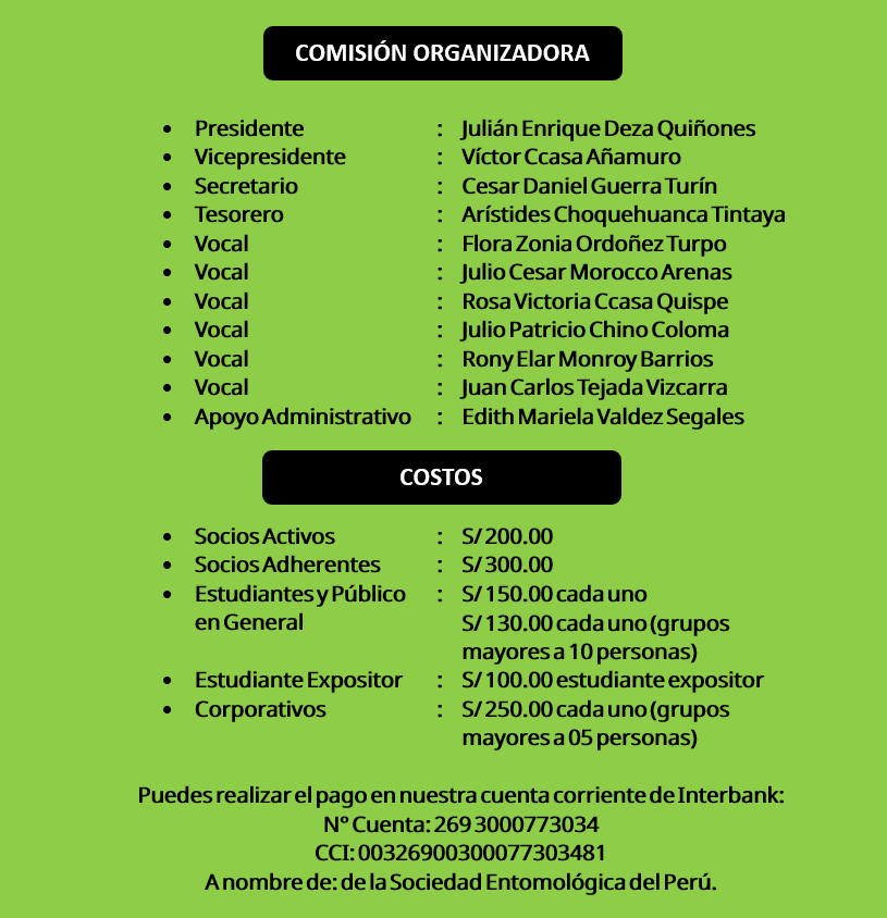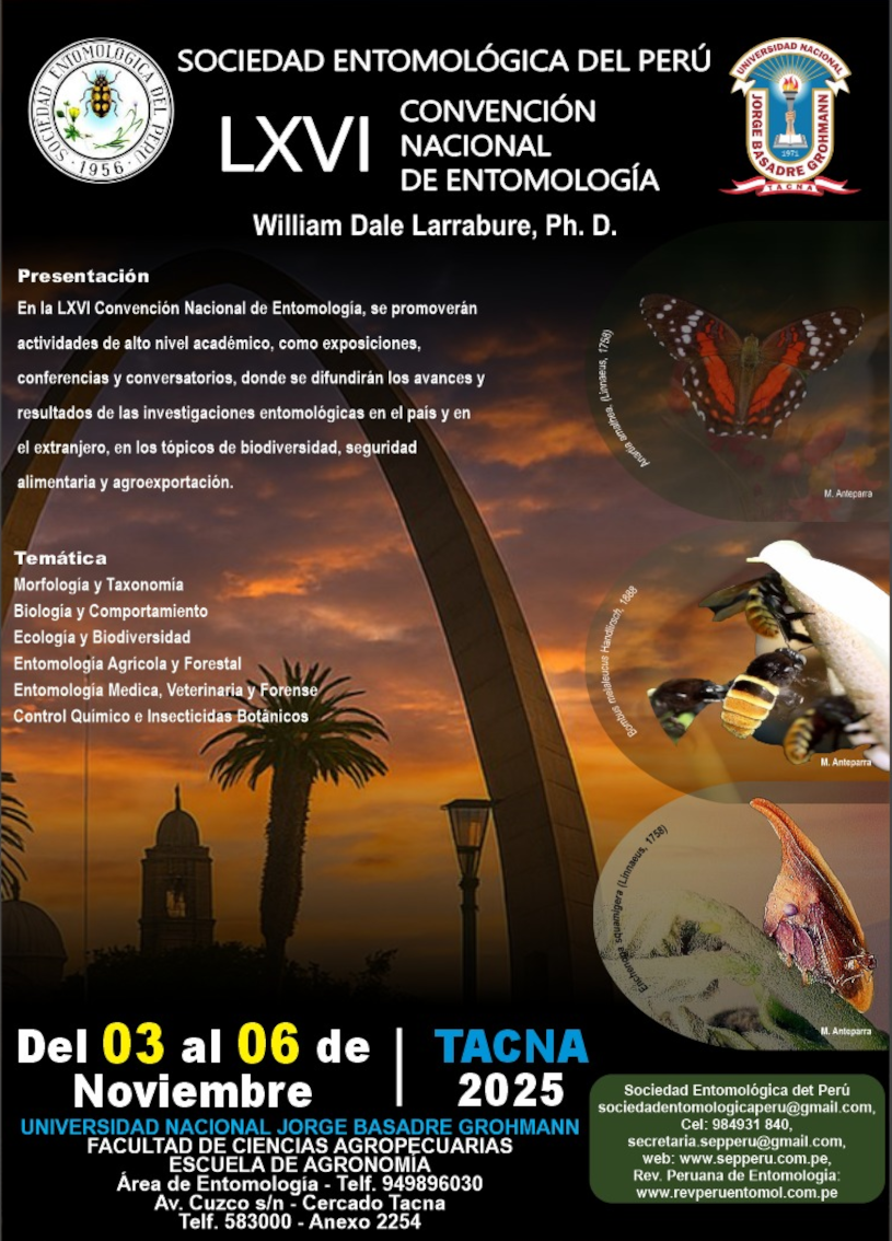 La Sociedad Entomológica del Perú, fundada el 30 de junio de 1956, les informa que están invitados a la LXVI, a desarrollarse en la ciudad de Tacna, organizado por la Universidad Nacional Jorge Basadre Grohmann, entre el 3 y 6 de noviembre del presente año. Por lo tanto se les notifica a los socios, académicos, investigadores y público en general a participar en este evento.